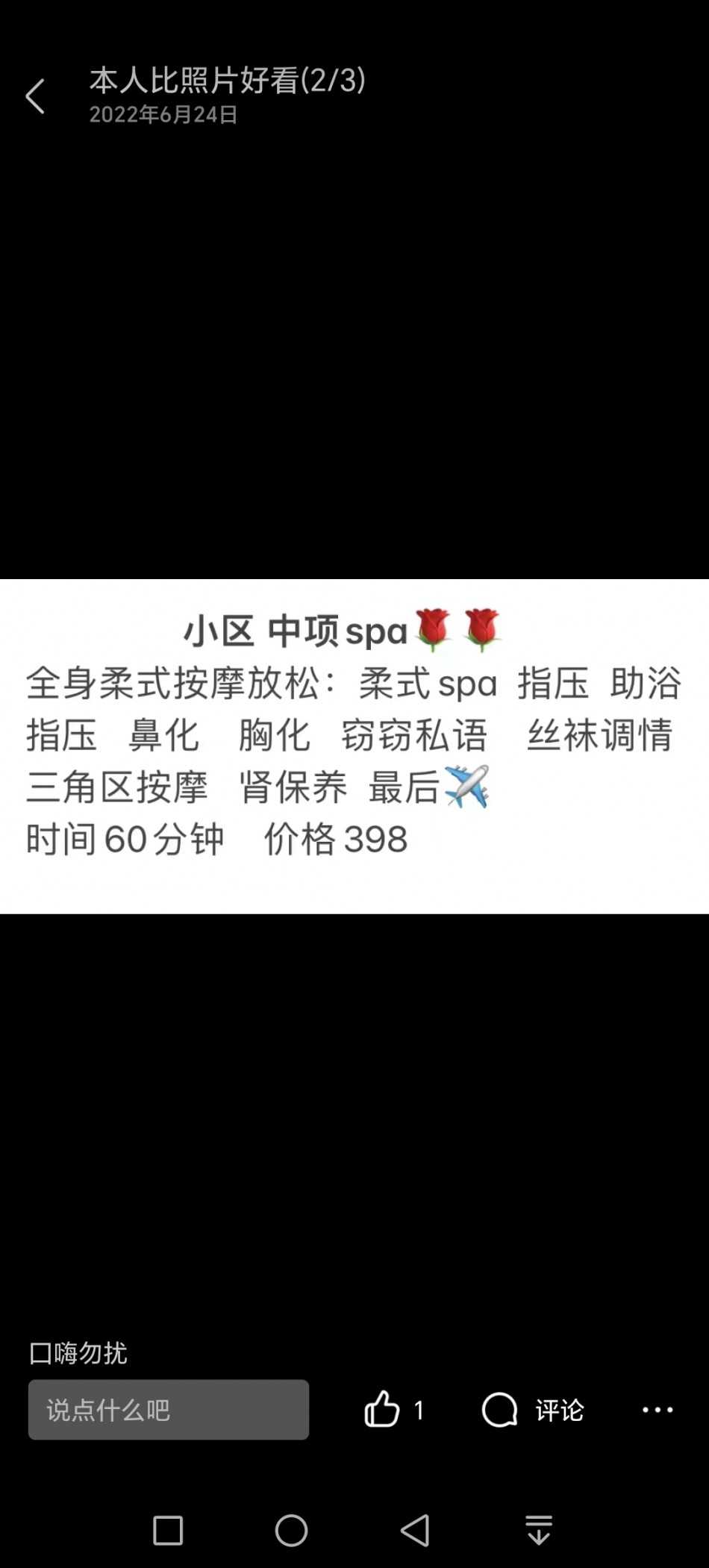 小狼甚是喜欢中项92/95这些,此女加了有段时间了,这次过去验证一下,和照片相似度70%左右吧,有点罗圈腿,胸挺大c+手感紧实q弹,怎么说呢,服务态度绝对没问题,课表服务都上来一遍,差点忘了是半l+飞机,总结就是体验一下不觉得亏,但是又不会第二遍反食。 ![]() |